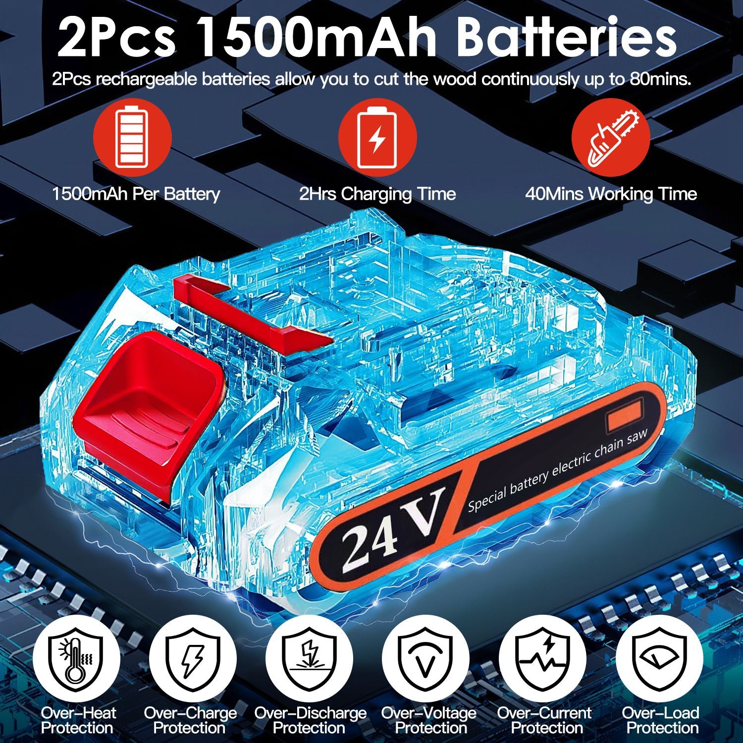 2Pcs 1500mAh Batteries & Cordless Design: 2Pcs 1500mAh rechargeable batteries allow you to cut the wood continuously up to 80mins. Besides, its lightweight and cordless design ensure effortless wood cutting, tree pruning and gardening without a sore hand.