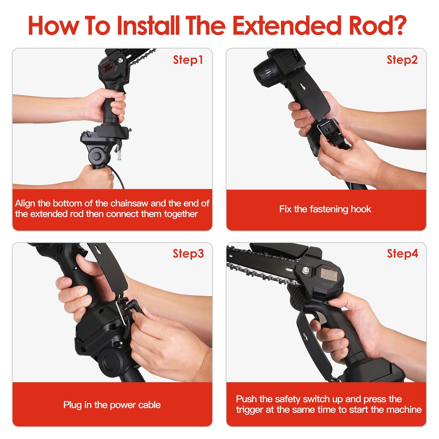 Length Adjustable Chainsaw: Comes with 3 extension rod, you can assemble the chainsaw to different length you need. You can use it as a handheld chainsaw with length of 13in, or you can extend it to 51.6in or 71.3in to cut the high tree branches that you can not reach easily. Besides, the head of the extended chainsaw can be adjusted 90° freely according to your needs.