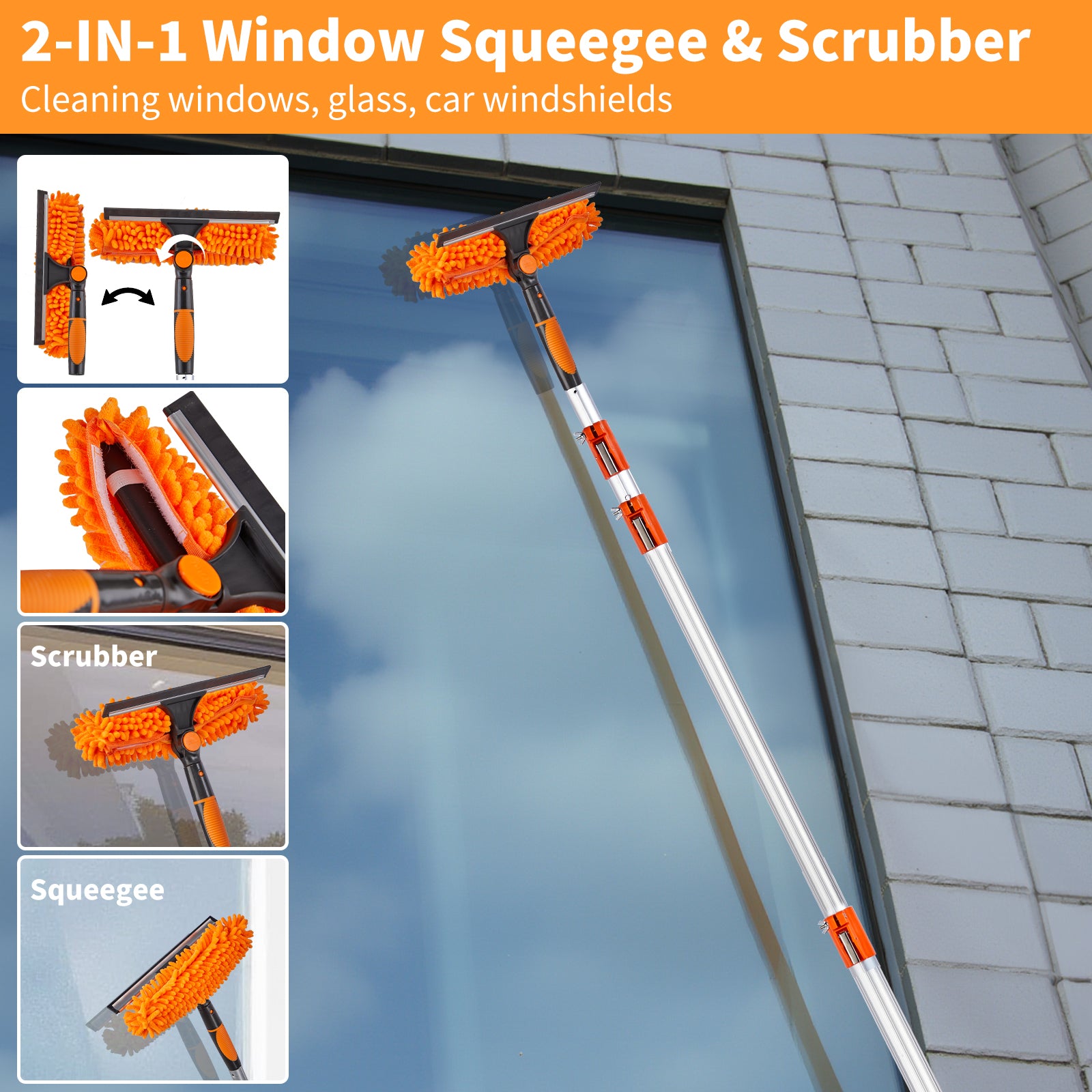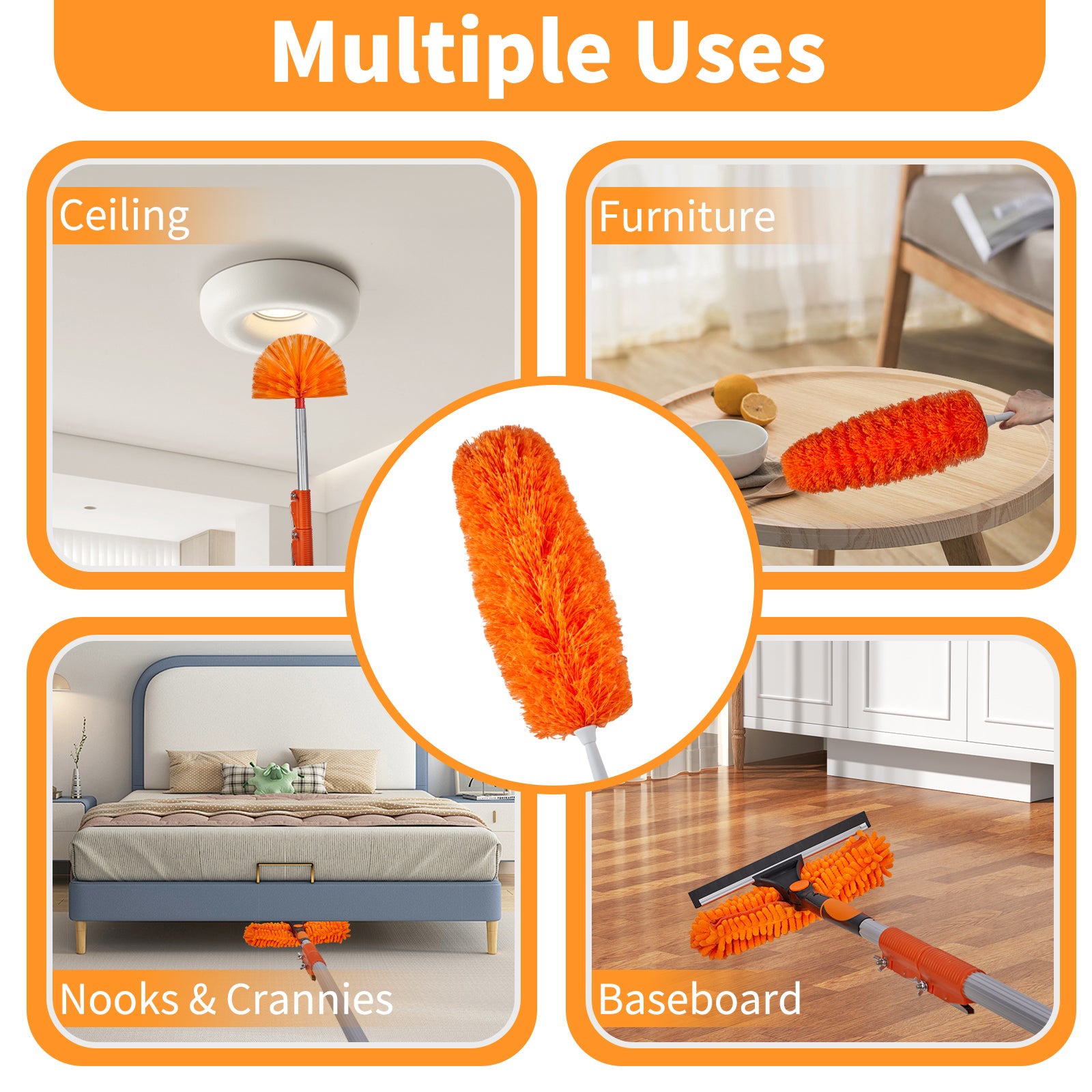 3-piece Duster Set: This microfiber hand duster set includes: 1 x 4-24 feet telescopic rod (the stainless steel rod can be installed as needed), 1 x cobweb duster, 1 x microfiber feather duster, 1 x 2 in 1 chenille head(scrubber&squeegee). By replacing different types of duster brush heads, you can deal with various cleaning scenarios and keep your home free from dust.