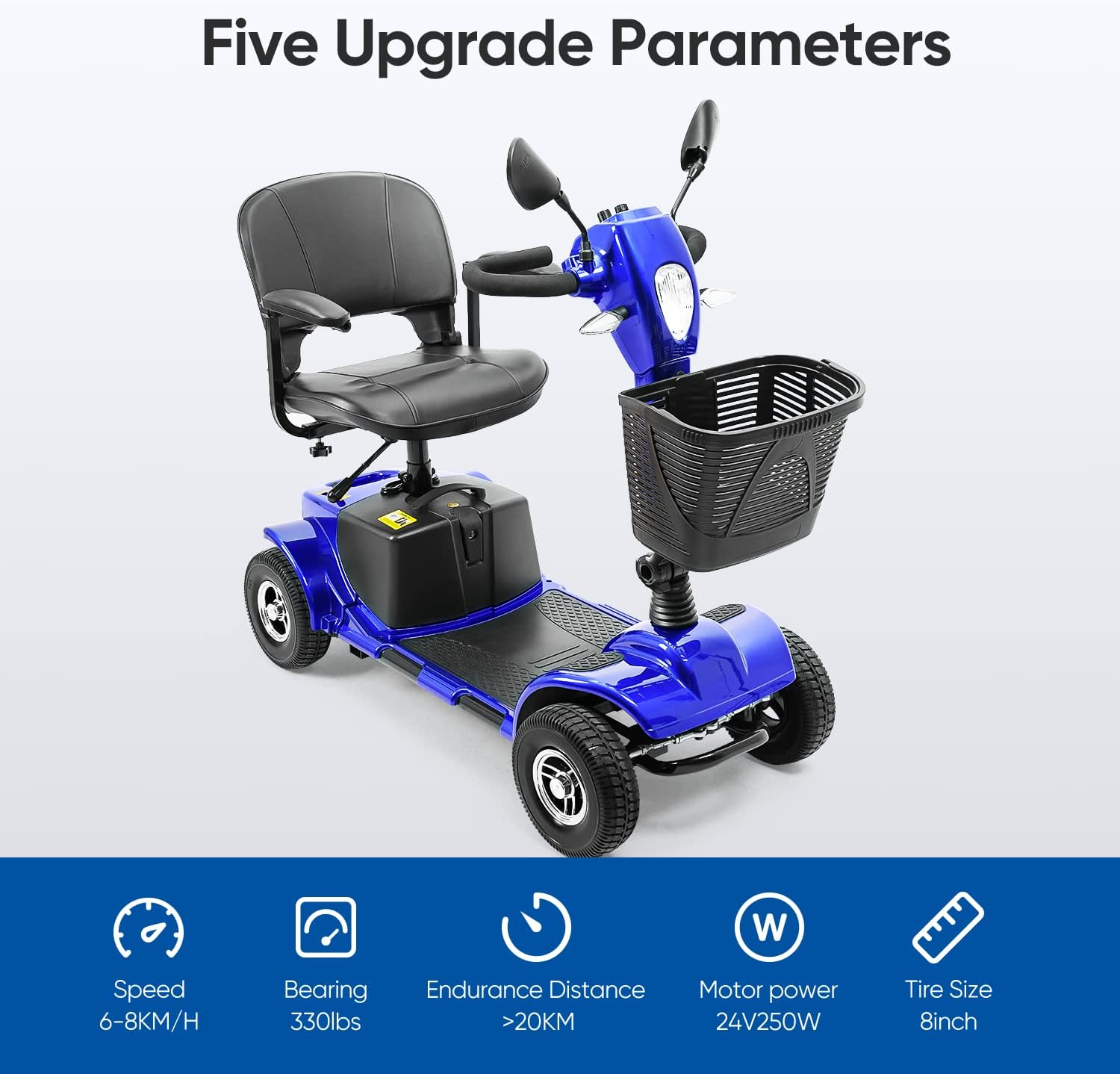 The 4 Wheel Mobility Scooter is an upgraded electric power mobile scooter designed for seniors and adults. It features a robust 250W motor, supports up to 330 pounds, and offers a driving range of 15-18 miles per charge. With adjustable components for comfort and safety features like anti-roller and mirrors, this scooter is perfect for those seeking independence and ease of mobility.