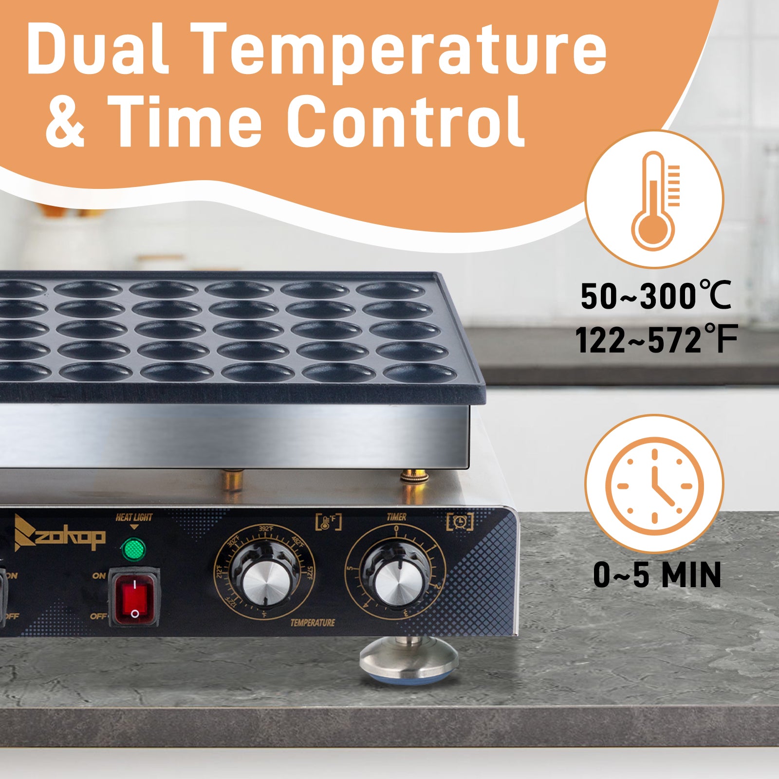 2. Efficient Waffle Maker: The highly conductive cast iron plate distributes heat evenly, providing golden, crispy pancakes with a baking area of 19.5"x10.2". It only takes 3-5 minutes to bake 50 Dutch pancakes (φ1.8"x0.4") at a time. The electric muffin maker comes with dual thermostats and timers, making it easy to control two different zones of the pancake maker.
