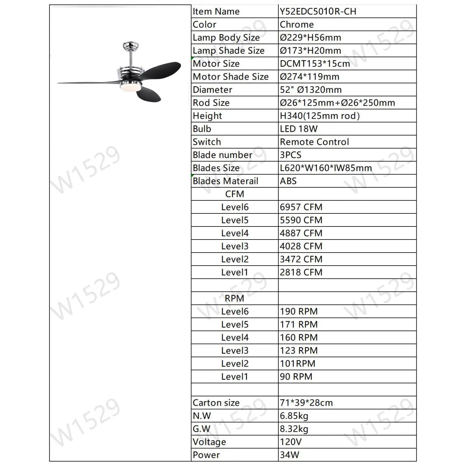 52" Modern Ceiling Fan with Light, 3 ABS Blades, DC Remote Control