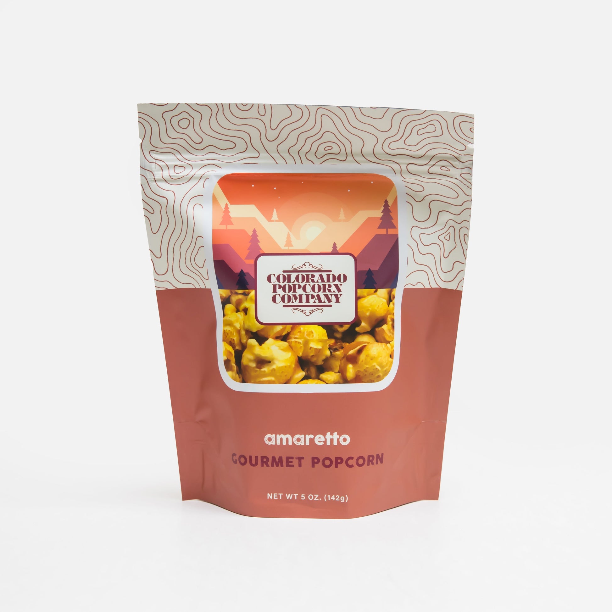 A bag of our Amaretto popcorn. Almond flavor candied popcorn tumbled with sliced almonds. Sweet and delicious!