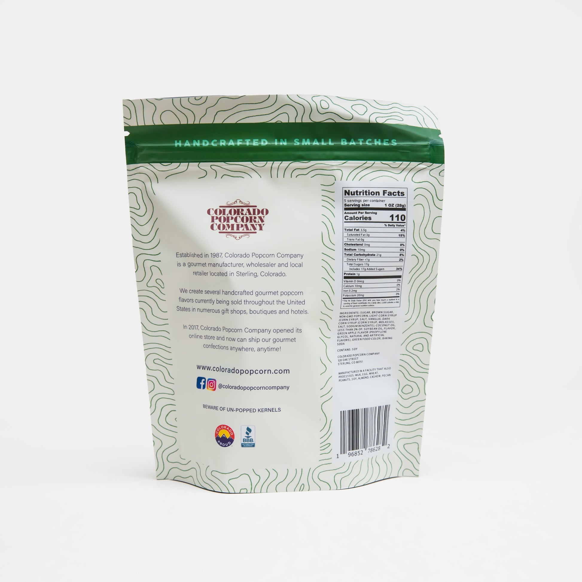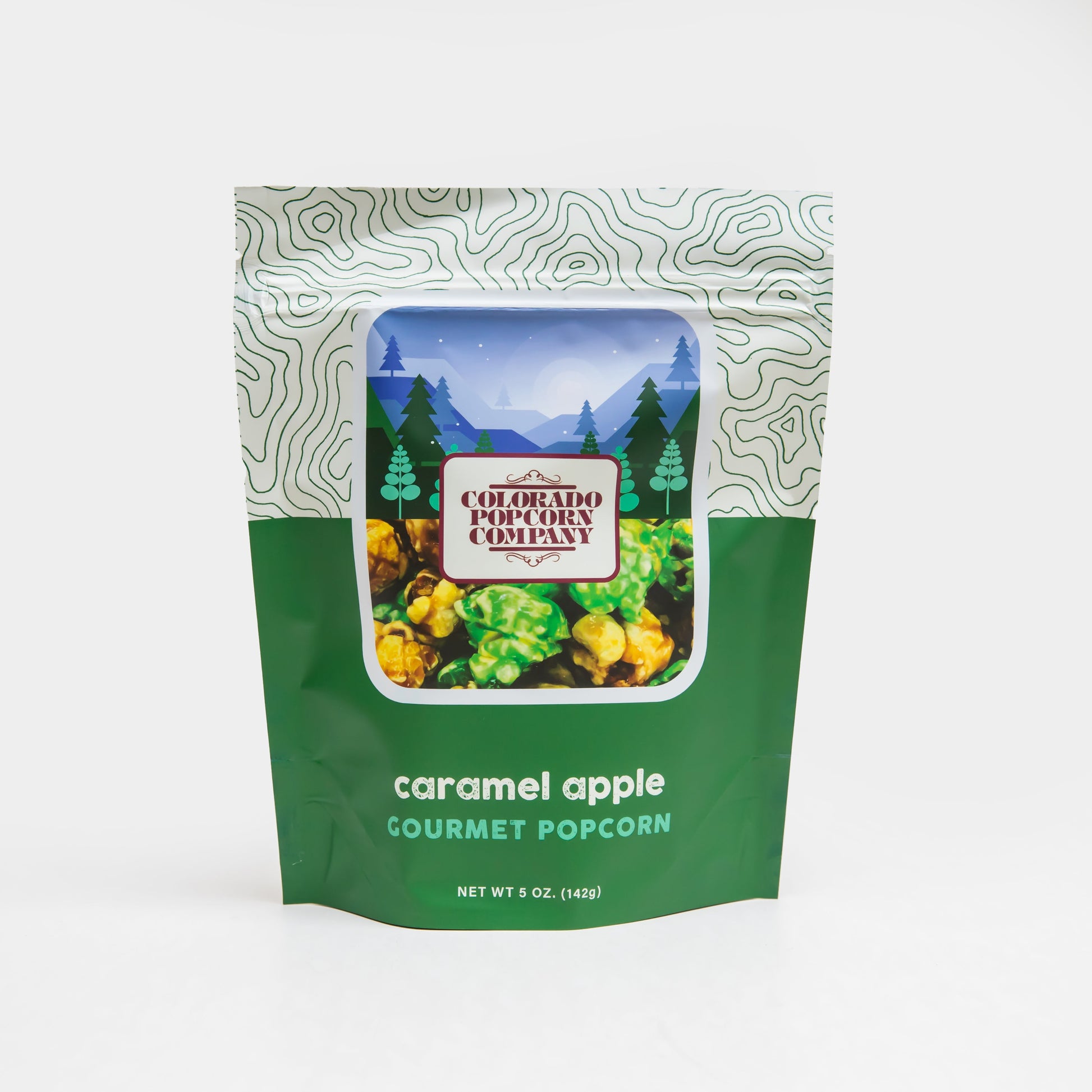 A bag of our Caramel Apple popcorn. Our classic caramel popcorn mixed with green apple-flavored candied popcorn. Great for the fall season but we eat it anytime!