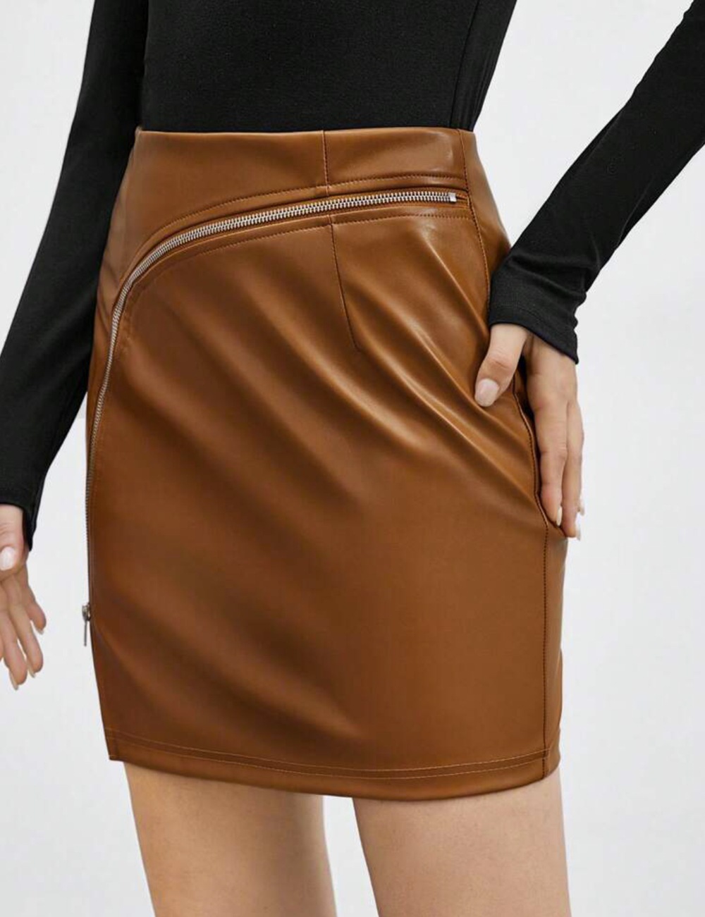 Cross border European and American midi skirt with fashionable waist bag, hip joint, zipper split, PU solid color, versatile for women