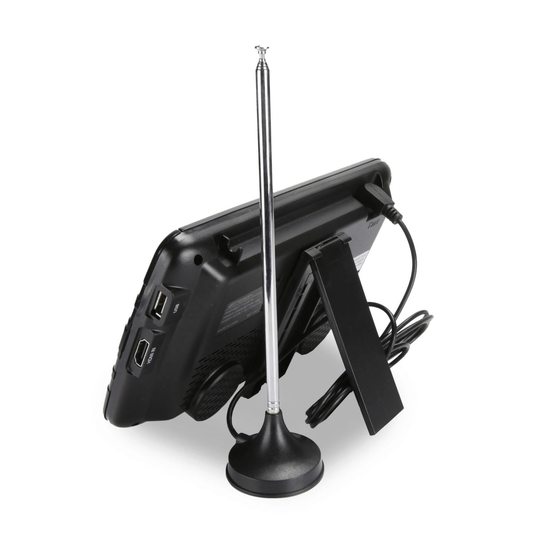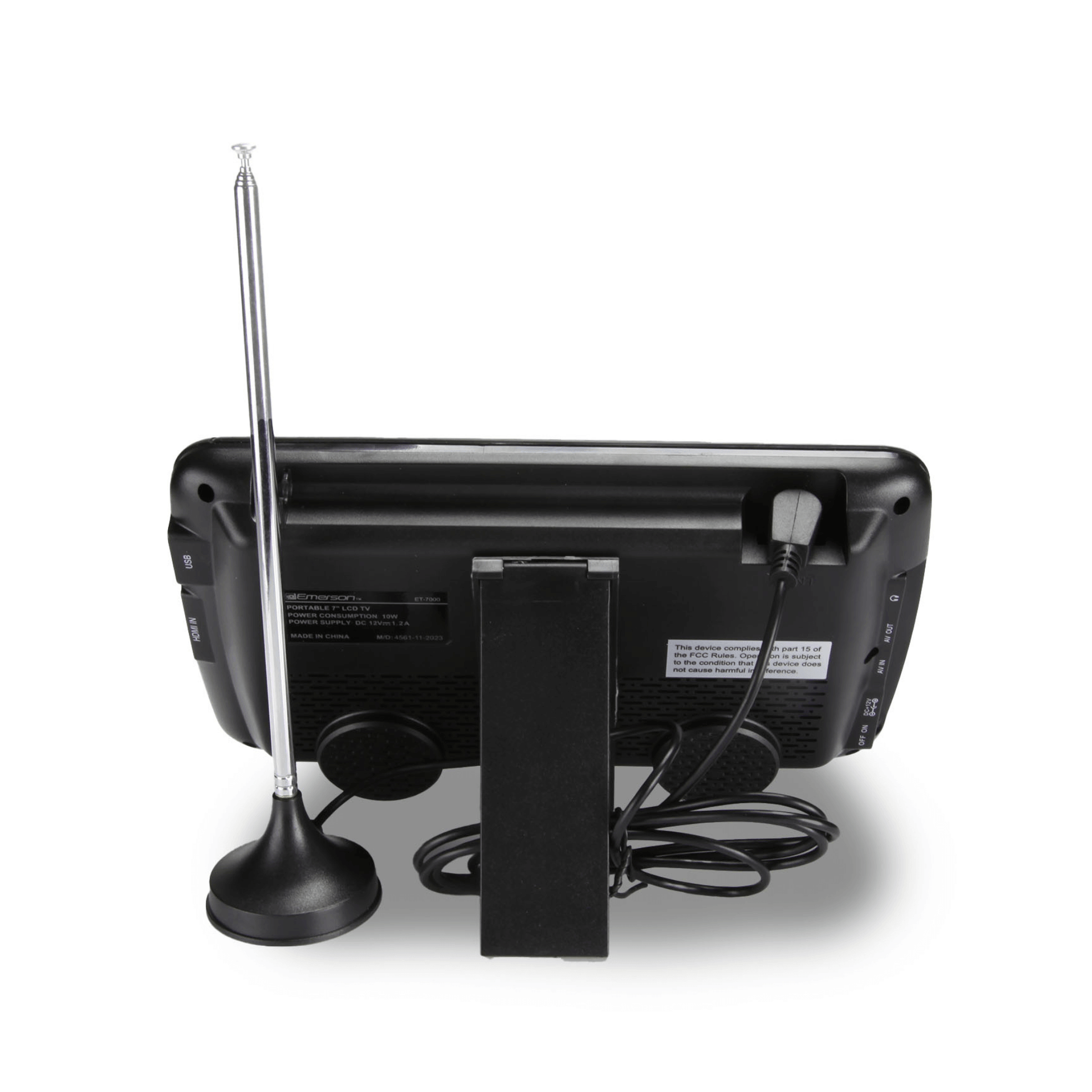 Discover the Emerson 7” Portable TV, an all-in-one entertainment device perfect for on-the-go use. Featuring a 7-inch TFT LCD screen with 800 x 480 resolution, it offers clear visuals and supports a wide range of multimedia formats from USB, including MP3, JPEG, MPEG, and more. Enjoy TV broadcasts with an ATSC/NTSC tuner and enhanced reception via an external antenna. It's equipped with FM Radio, a 3-way power system (AC adapter, DC car adapter, and a rechargeable battery with 1.5 hours playtime), A/V connectivity, and built-in stereo speakers. Compact and versatile, it's ideal for travel and home use.