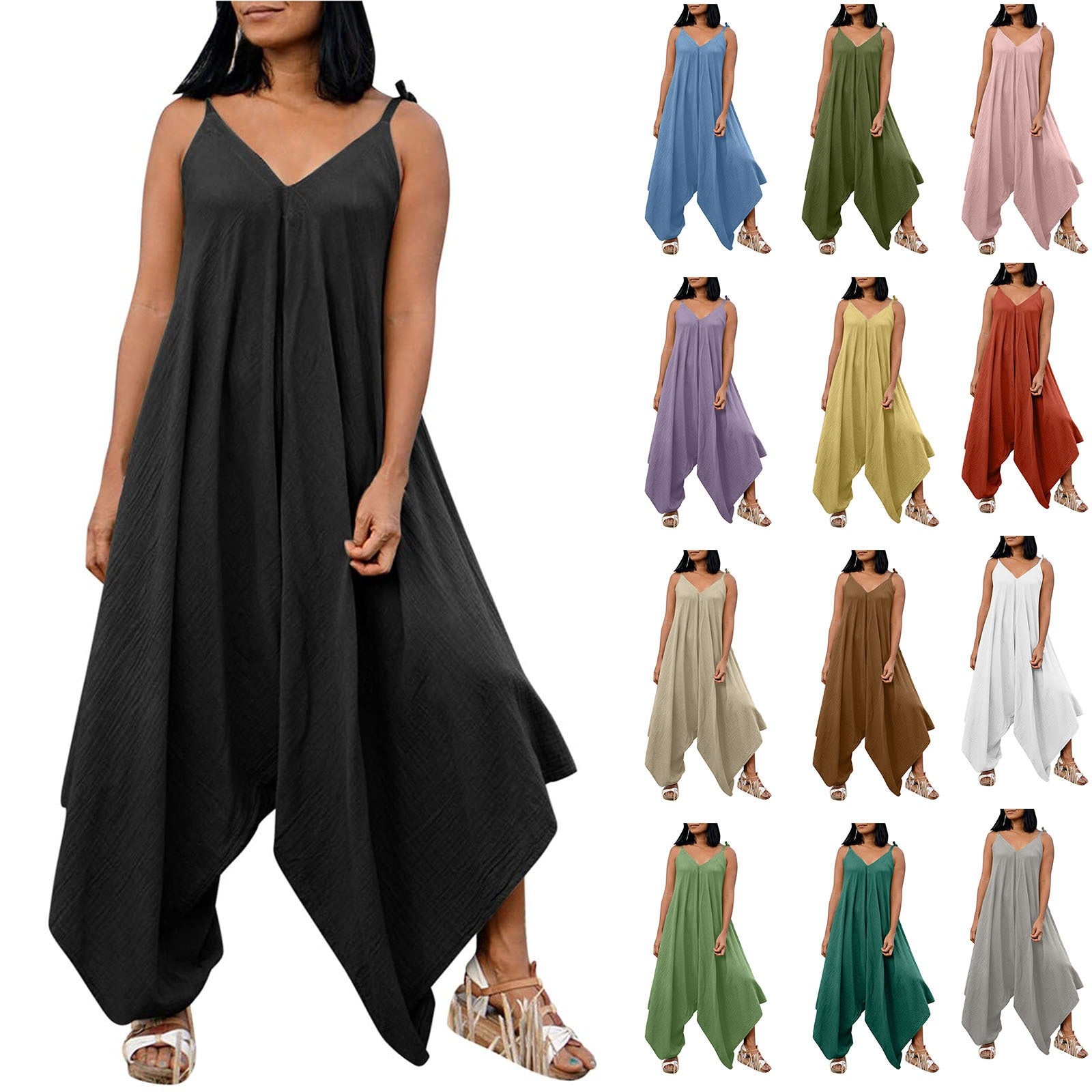 Solid color suspender backless V-neck sleeveless loose wide leg pants jumpsuit