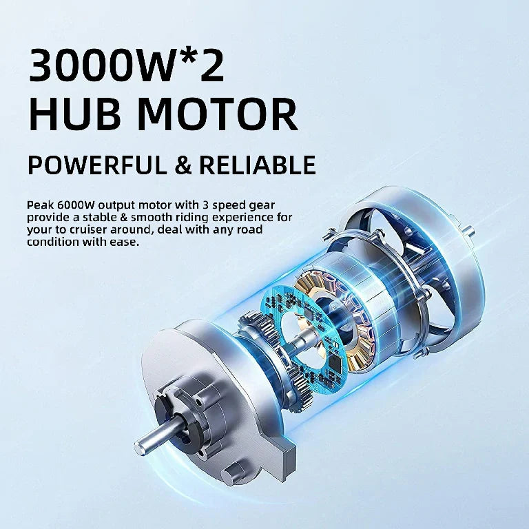 The FREEBOY H8 features dual 3000W motors, 50 mph top speed, 50–56 mile range, hydraulic disc brakes, and 11” off-road tires. Built for speed, safety, and durability.