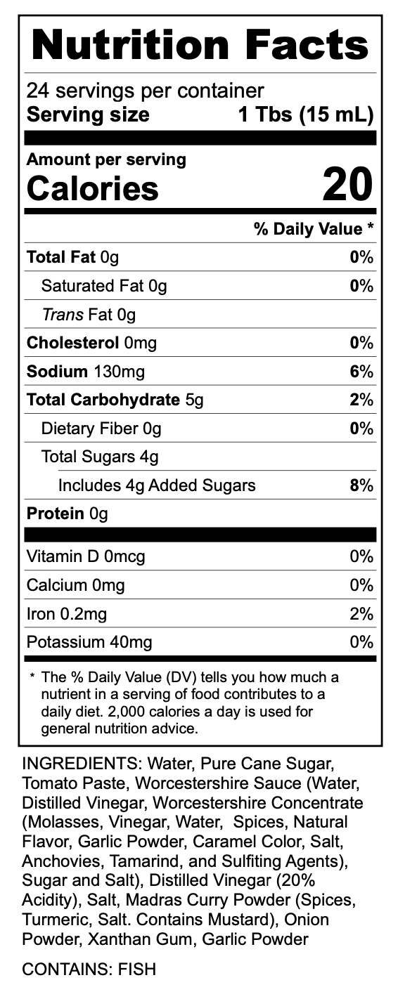 Ingredients: Water, Pure Cane Sugar, Tomato Paste, Worcestershire Sauce (Water, Distilled Vinegar, Worcestershire Concentrate(Molasses, Vinegar, Water, Spices, Natural Flavor, Garlic Powder, Caramel Color, Salt, Anchovies, Tamarind, and Sulfiting Agents) Sugar and Salt) Distilled Vinegar (20% Acidity), Salt, Madras Curry Powder (Spices, Turmeric, Salt, Contains Mustard), Onion Powder, Xantham Gum, Garlic Powder