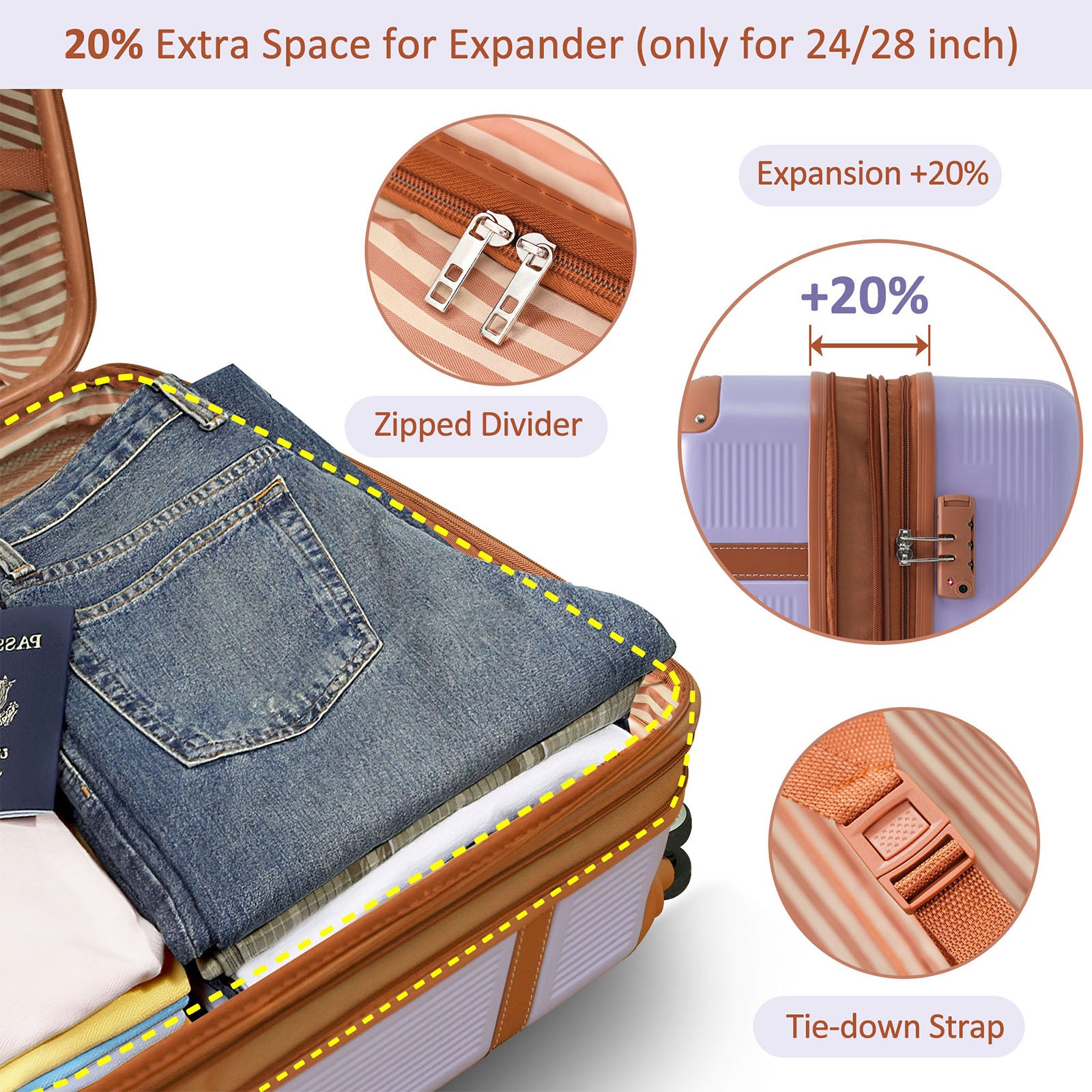 Expansion function adds 20% extra space (only for 24-inch and 28-inch). The 24-inch and 28-inch luggage feature reinforced side handles and bumper feet for easy portability.