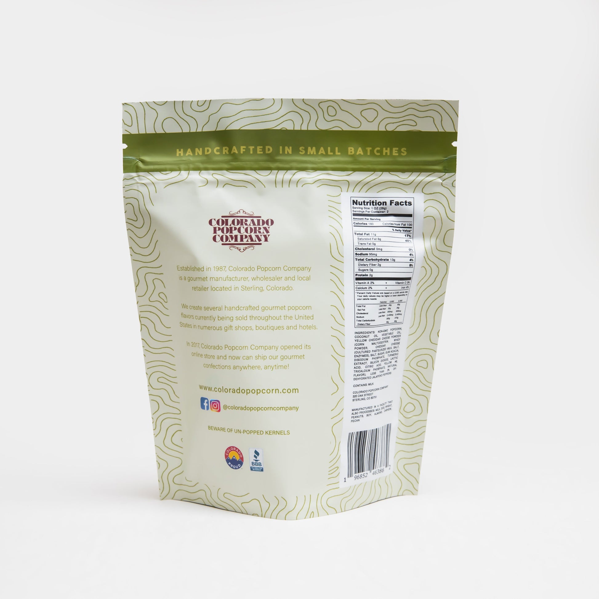 A bag of our Jalapeño cheddar popcorn. Popcorn tumbled in Jalapeño infused vegetable oil and coated with real cheddar cheese!