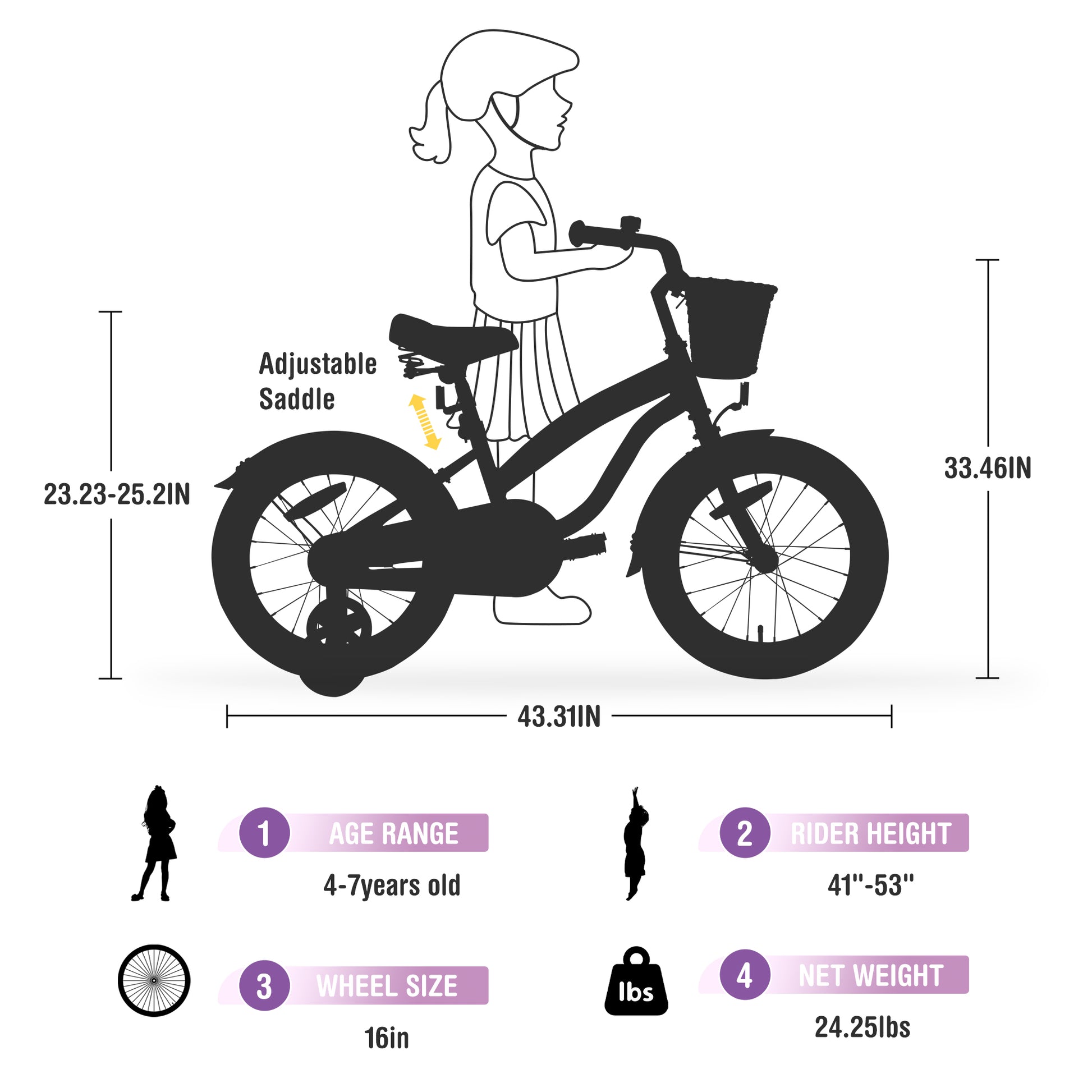 Multiple Colors,Girls Bike for 4-7 Years Old Kids,16 inch wheel ,Training Wheels Included