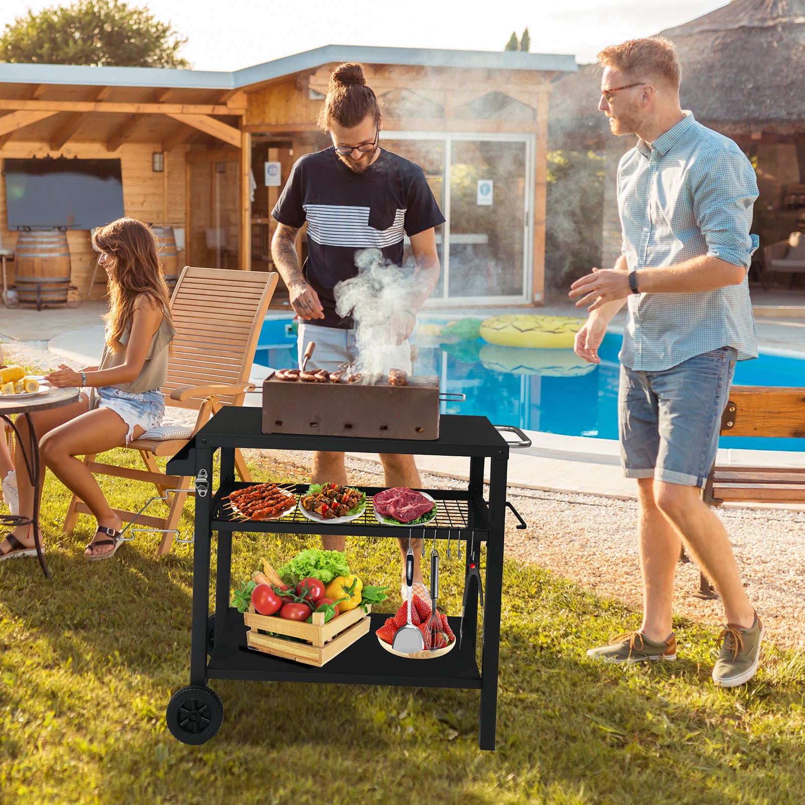 Outdoor Grill Cart Three-Shelf Grill Table, Movable BBQ Trolley Food Prep Cart with Two Wheels & Hooks, Black