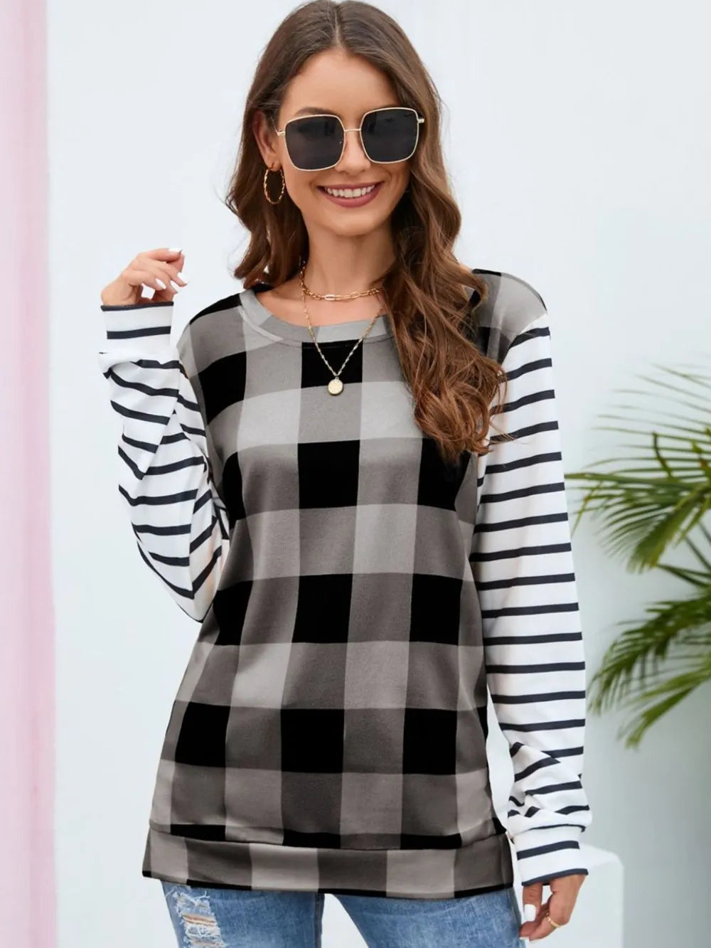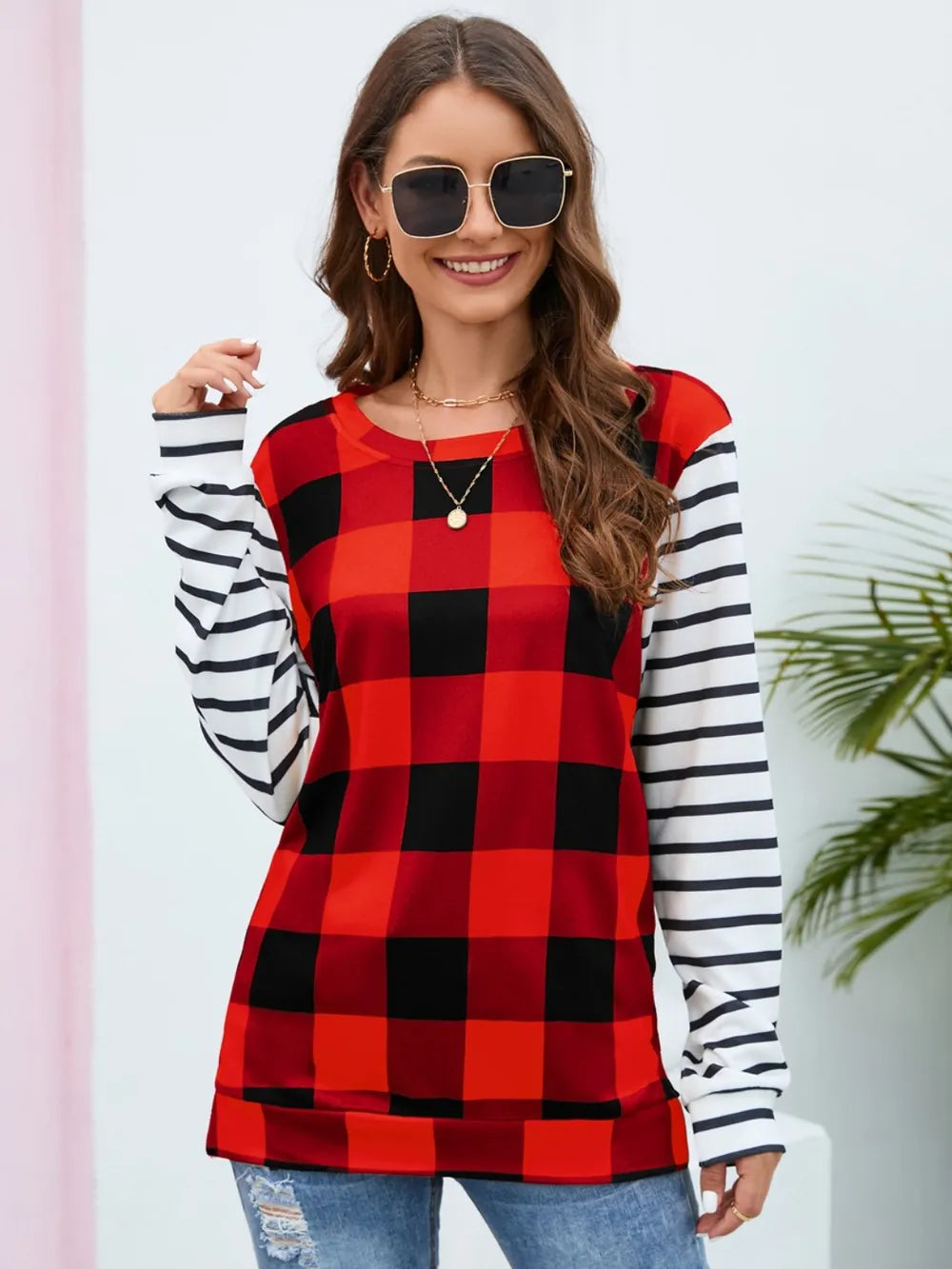 Plaid Striped Round Neck Long Sleeve T-Shirt