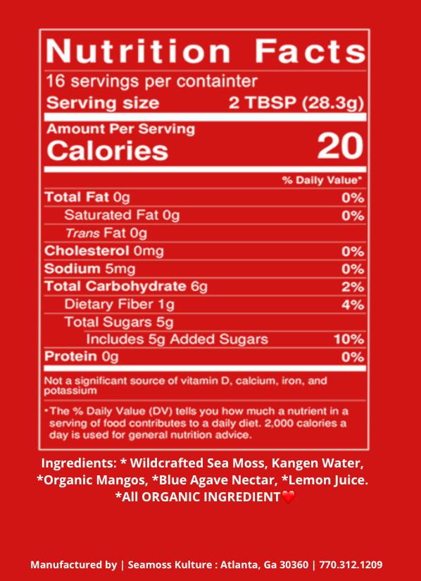 Made with Wildcrafted Sea Moss, Kangen Water, Organic Mangos, Blue Agave Nectar, Lemon Juice.