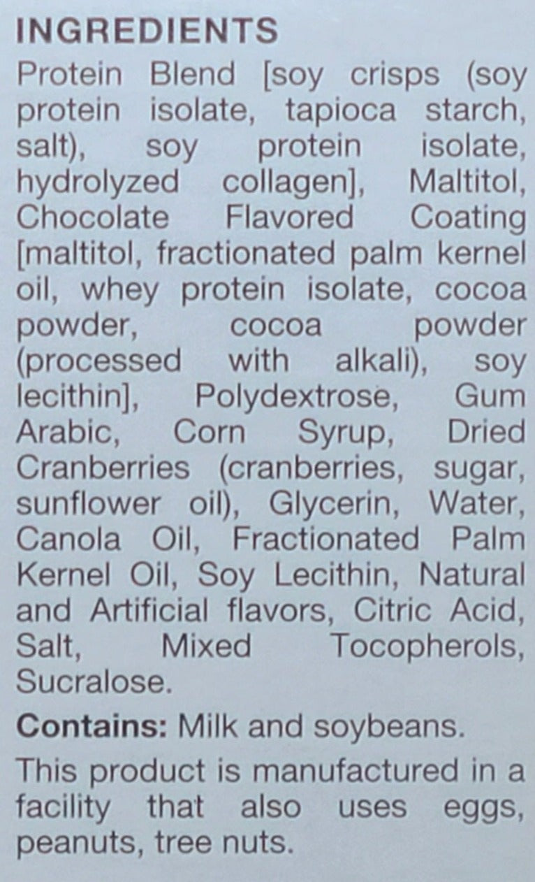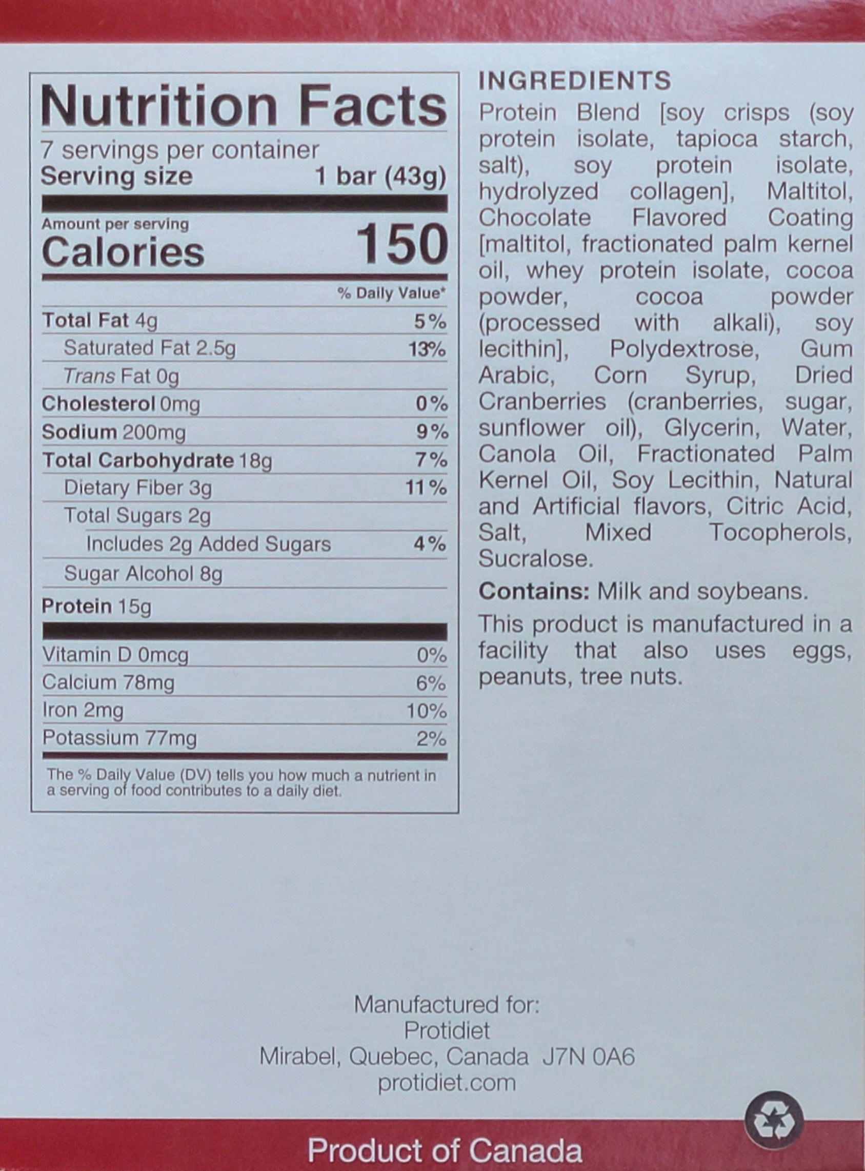 ProtiDiet RaspBerry Dark Chocolate Square Bar Nutrition Facts