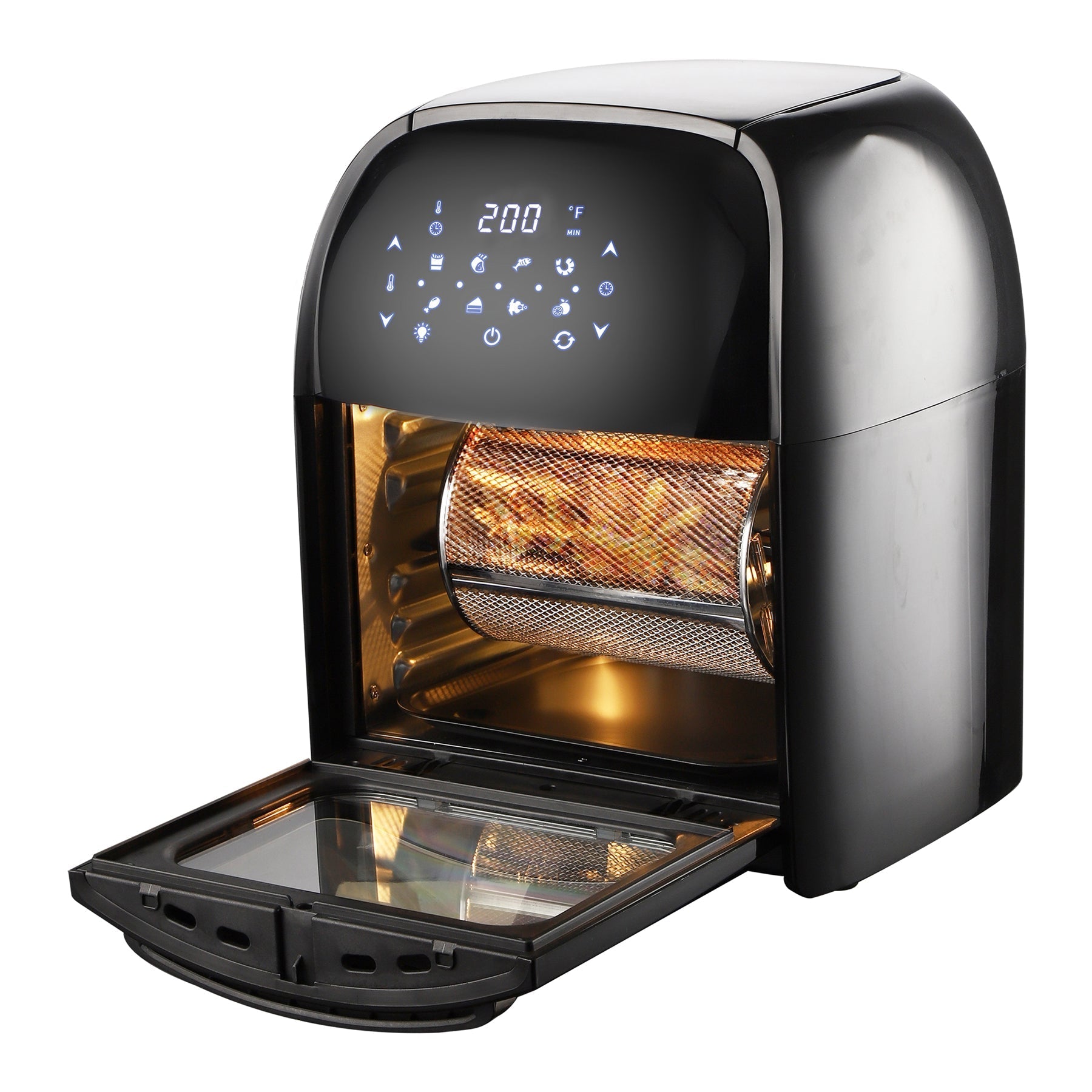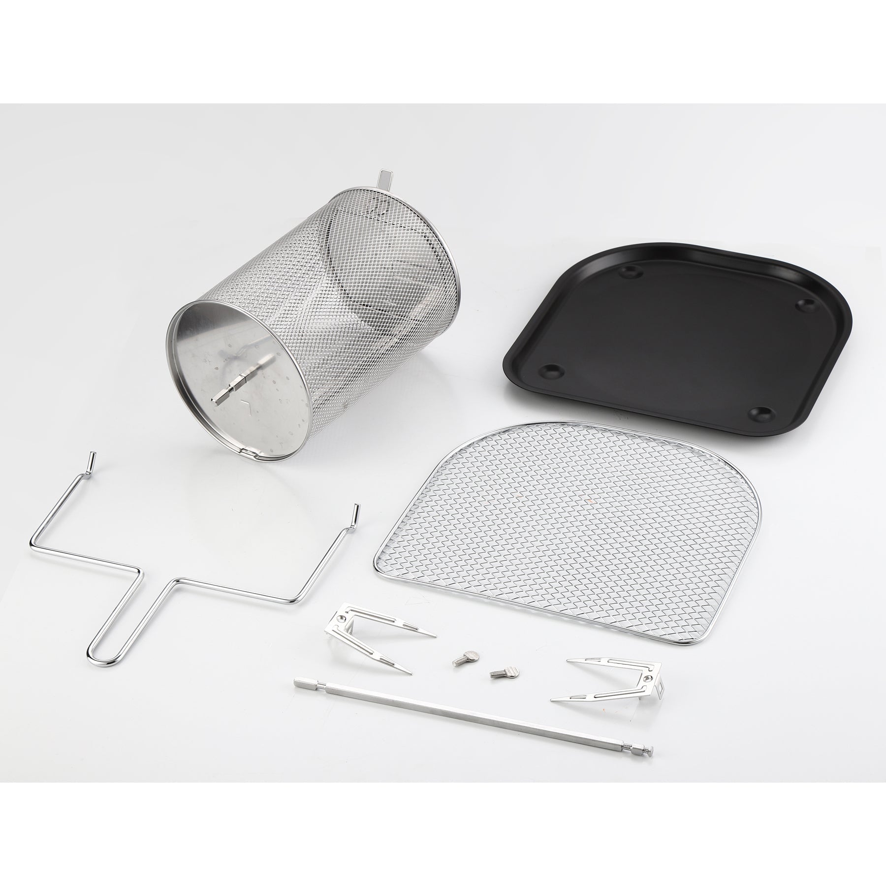 Accessories: Rotating Mesh Basket, Drip Tray, Rotisserie Fetch Tool, Air Flow Tool, Air Flow Rack, Rotisserie Shaft, 1 Set Of Forks And Screws, Manual