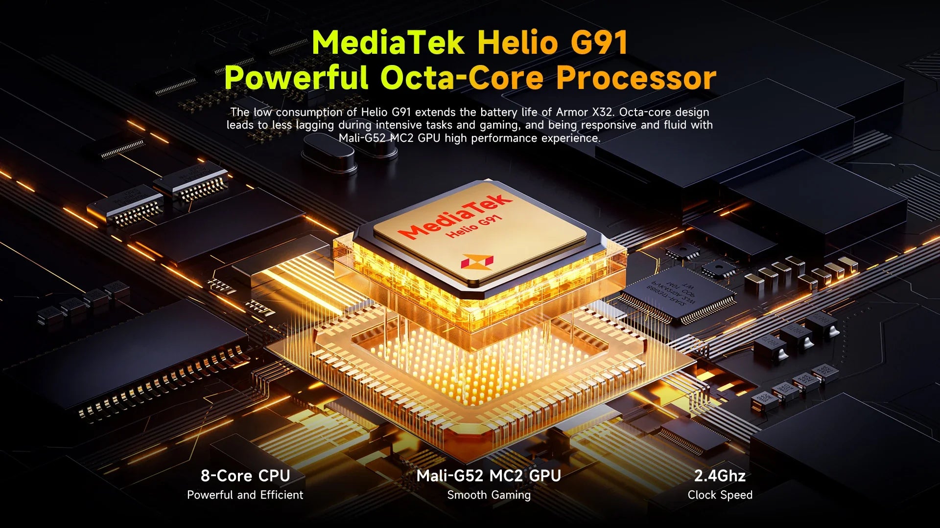 The low consumption of Helio G91 extends the battery life of Armor X32. Octa-core design leads to less lagging during intensive tasks and gaming, and being responsive and fluid with Mali-G52 MC2 GPU high performance experience.