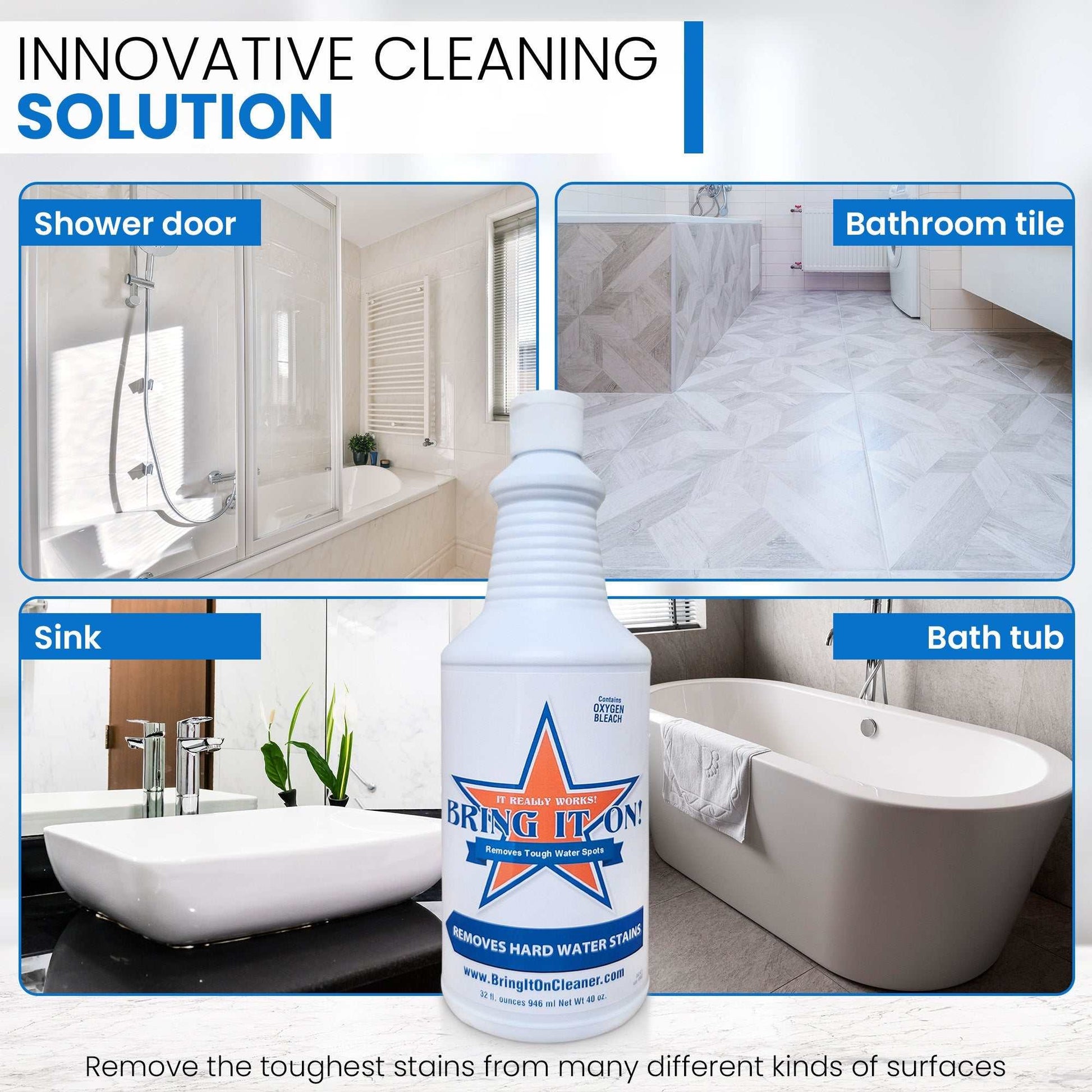 Bring It On Cleaner is a hard water spot remover guaranteed to quickly and easily remove water spots and hard water stains and has a money back guarantee.Use as a fiberglass tub cleaner, a glass shower door cleaner. Use Bring It On Cleaner for tough cleaning problems.