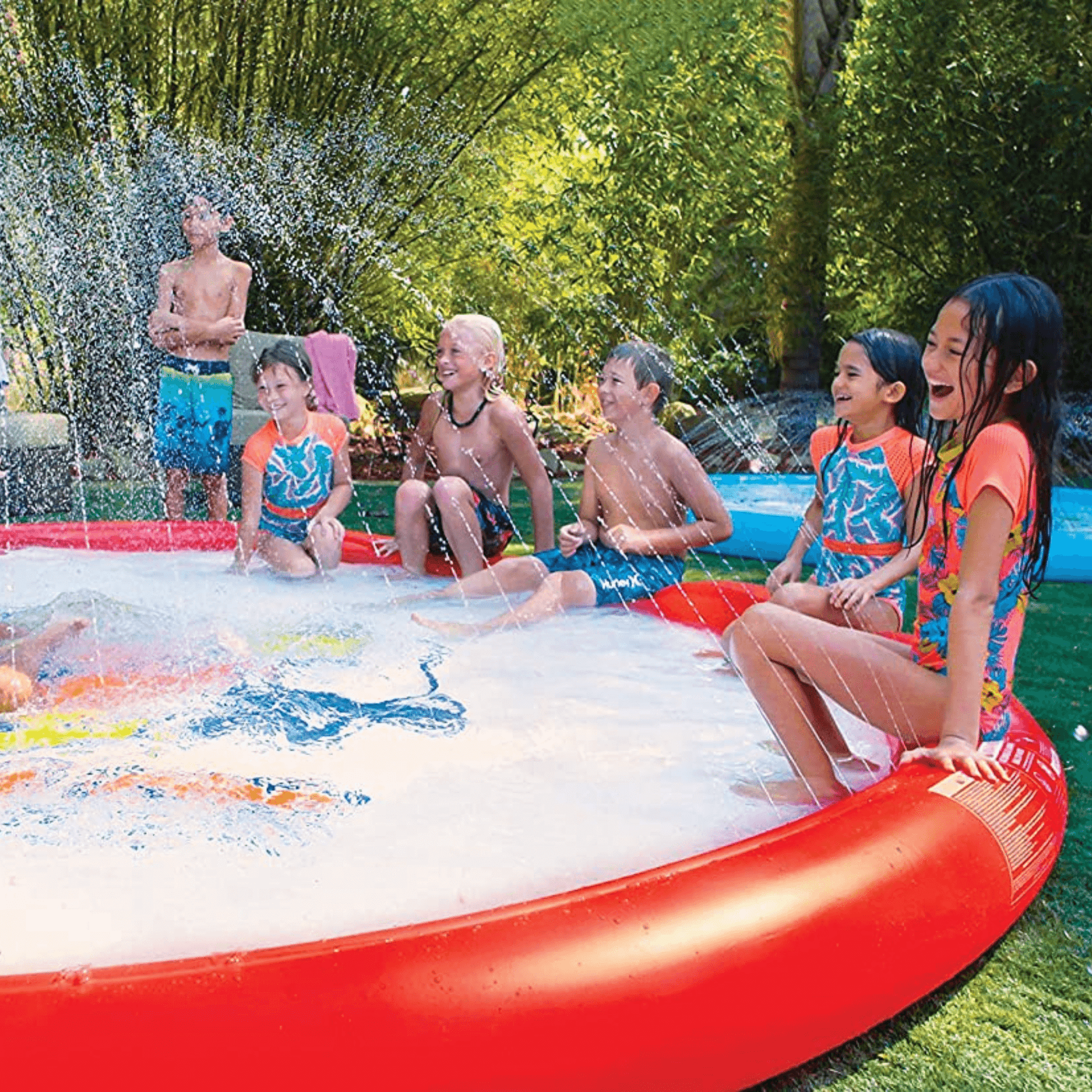 Giant 12′ Diameter Inflatable Backyard Splashpad with sprinkler and wading pool. Extra-thick, heavy-duty PVC, more than twice as thick as most splashpads on the market. Built-in sprinkler system that is adjustable. A waterpark in your backyard. Large enough for the entire family to use as a wading pool.